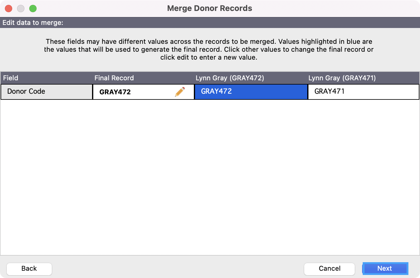 Fields highlighted in blue will be in the final record. You can make any changes in these fields for what you want the final record to to be. Here you can remove the indicator that you used to mark this record as the one tied to the merged Donor record.