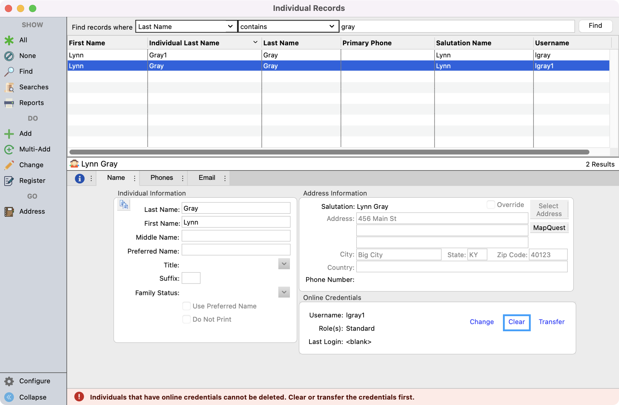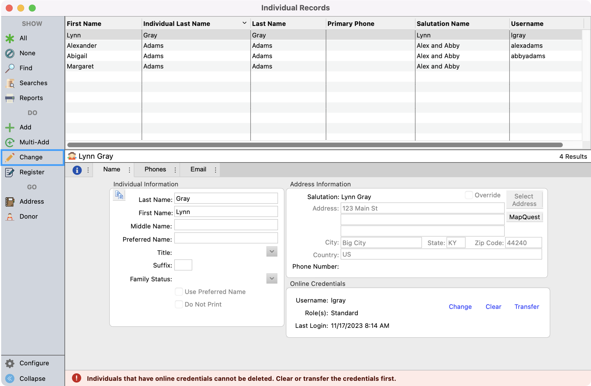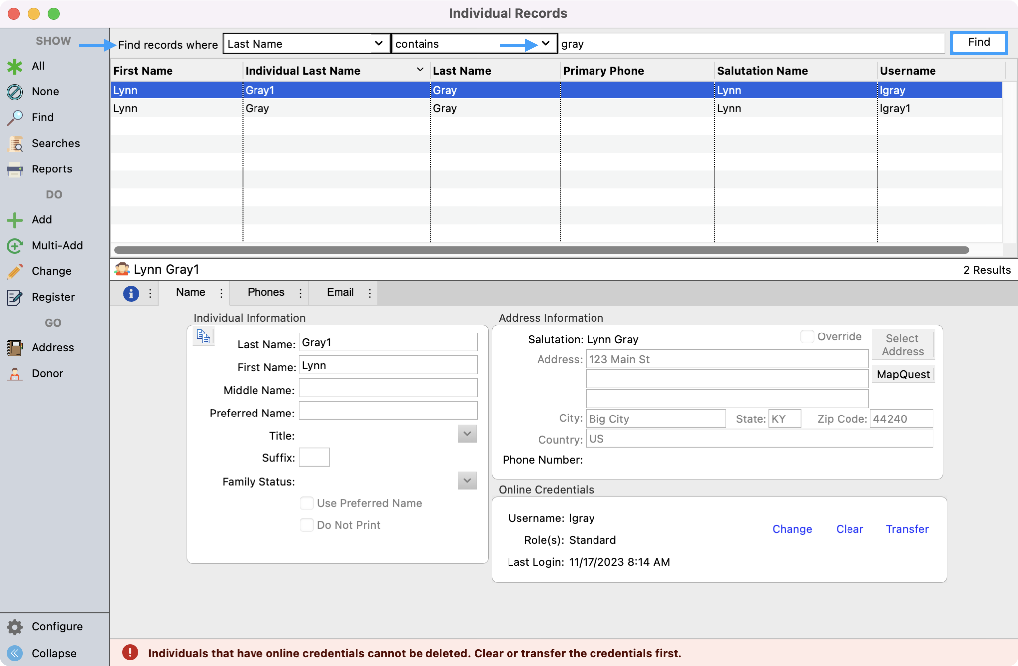Before you can merge the Individual records together, only one record can have Online Credentials. You will need to clear the online credential for the Individual records that will be merged under the main record. To be able to easily see which records have a username, you can configure your results window to display the username.