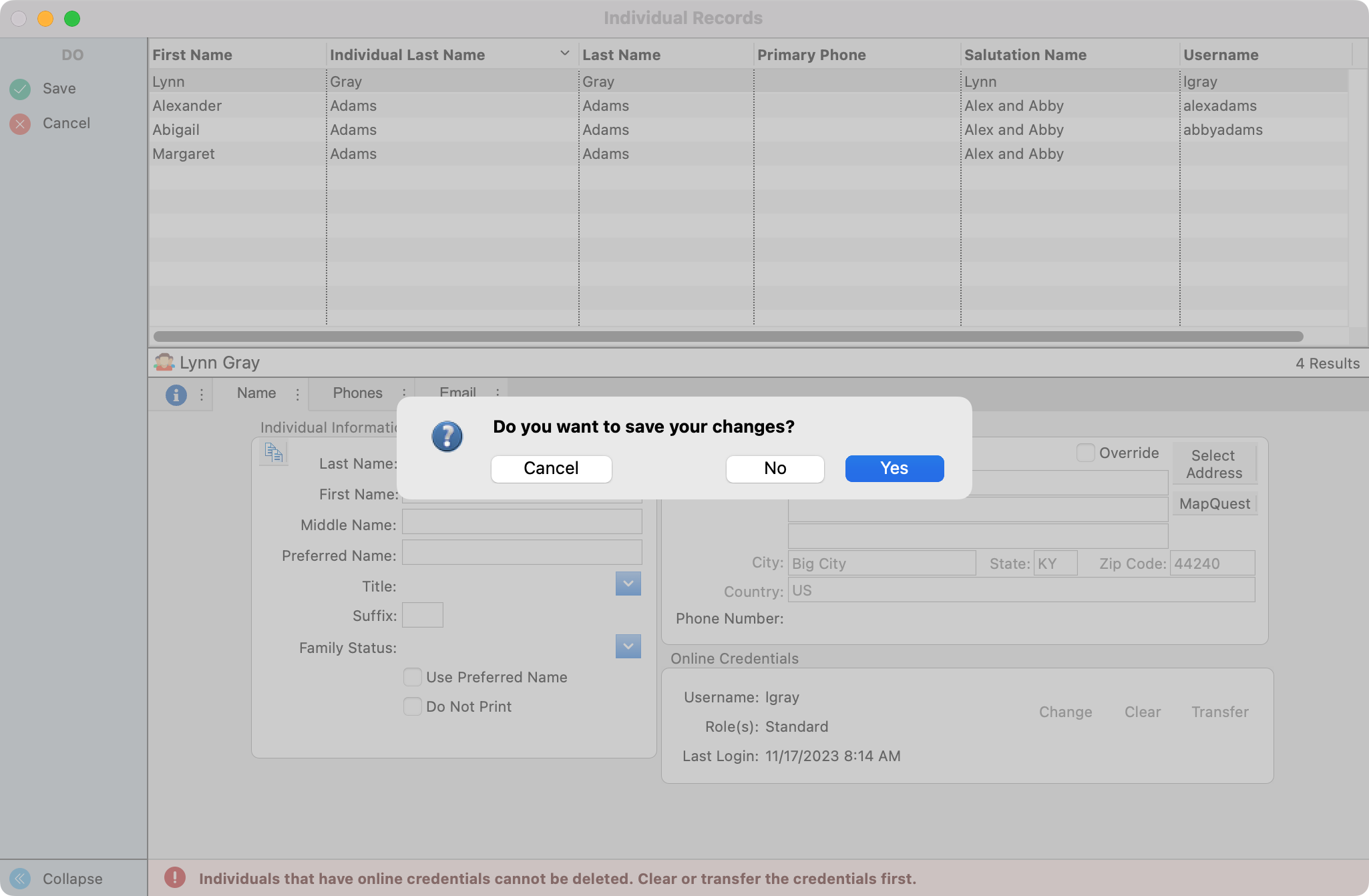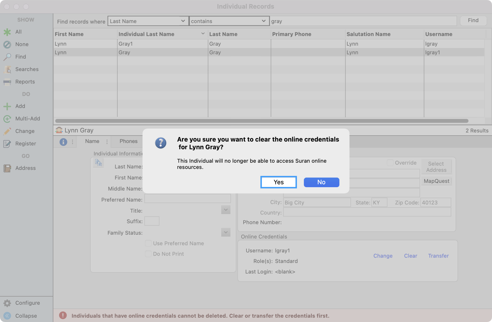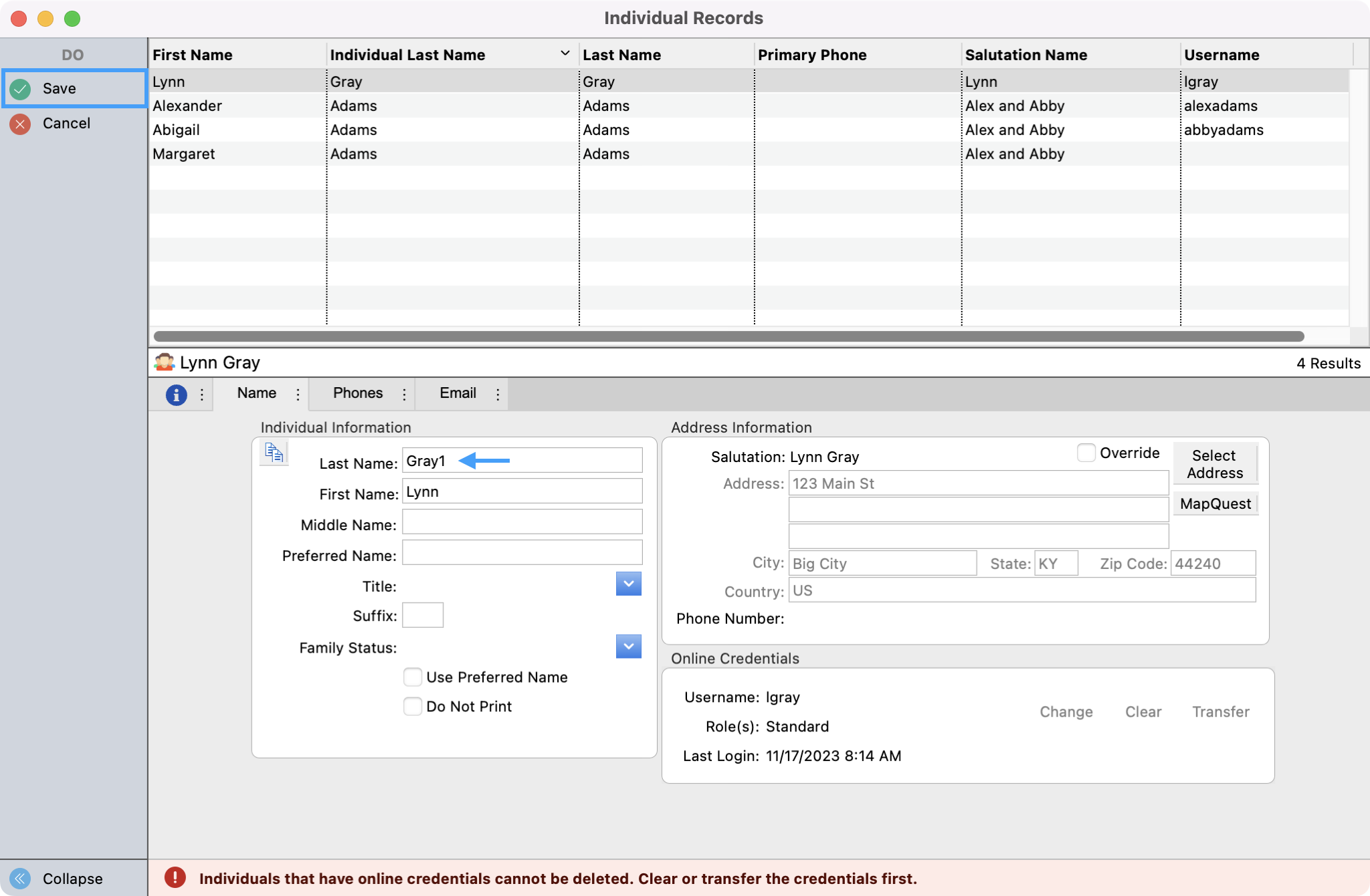 Before you can merge the Individual records together, only one record can have Online Credentials. You will need to clear the online credential for the Individual records that will be merged under the main record. To be able to easily see which records have a username, you can configure your results window to display the username.