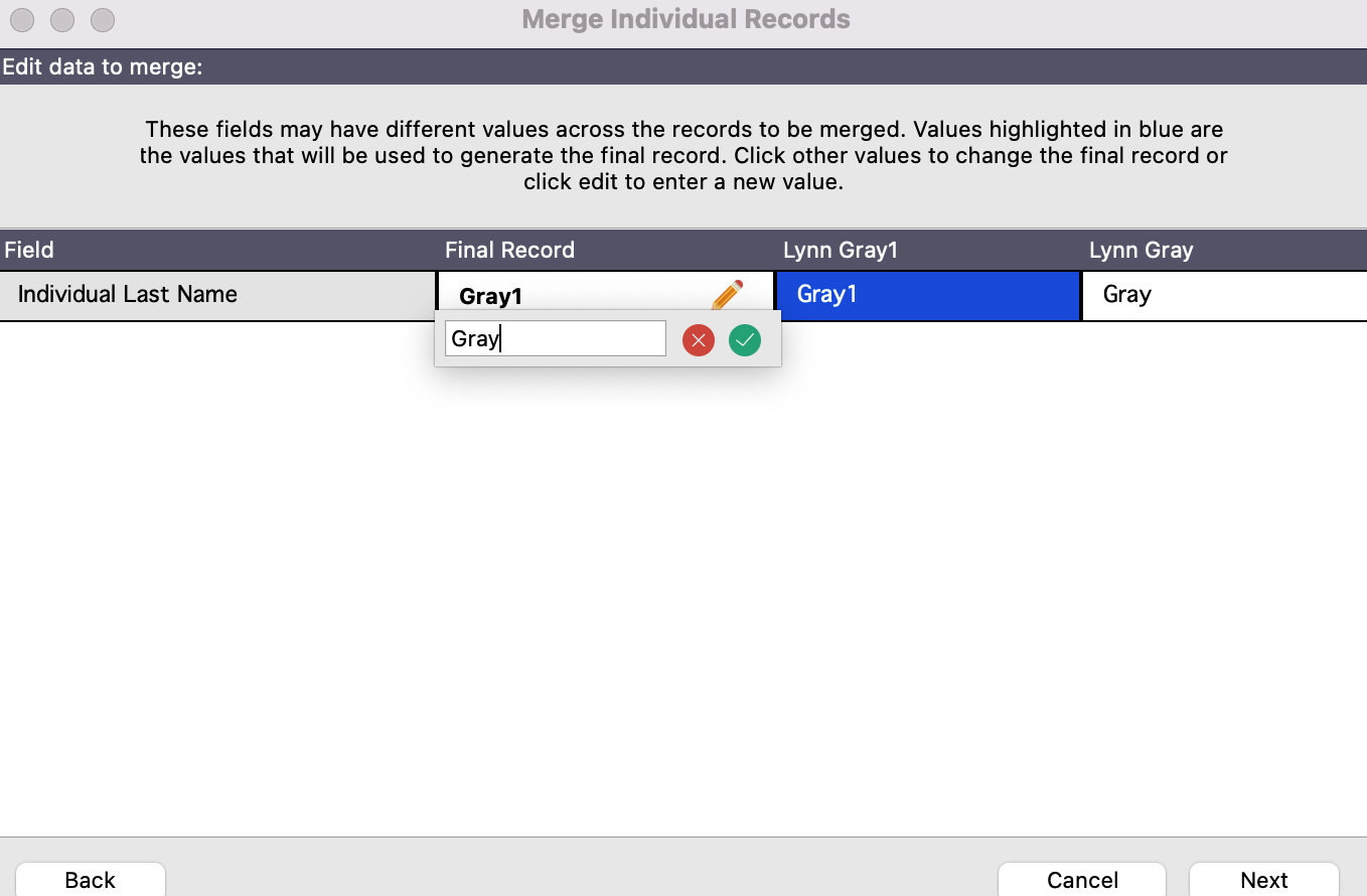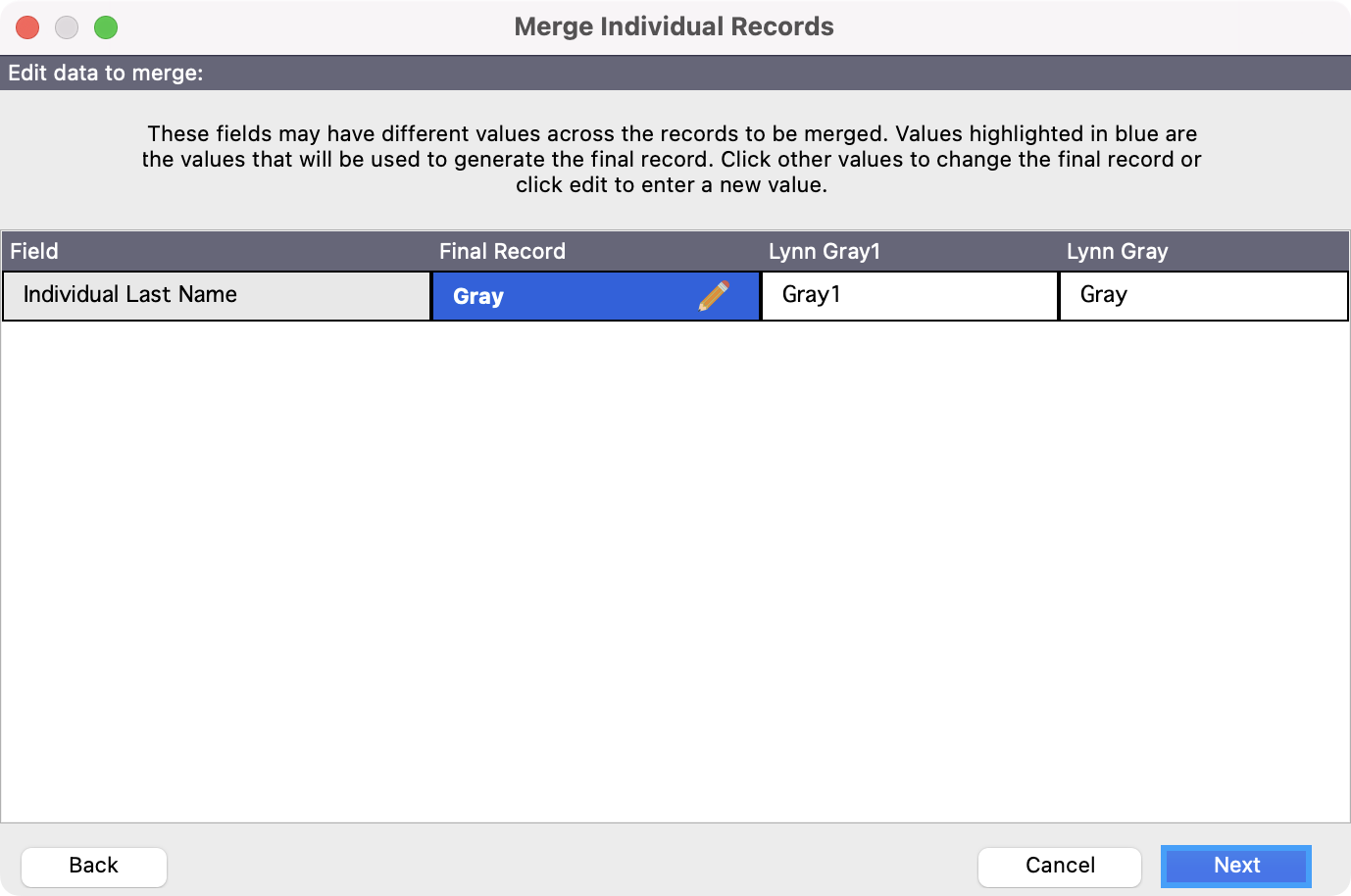 Fields highlighted in blue will be in the final record. You can make any changes in these fields for what you want the final record to to be.
