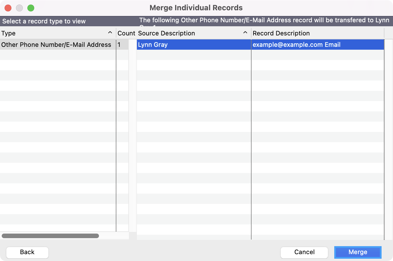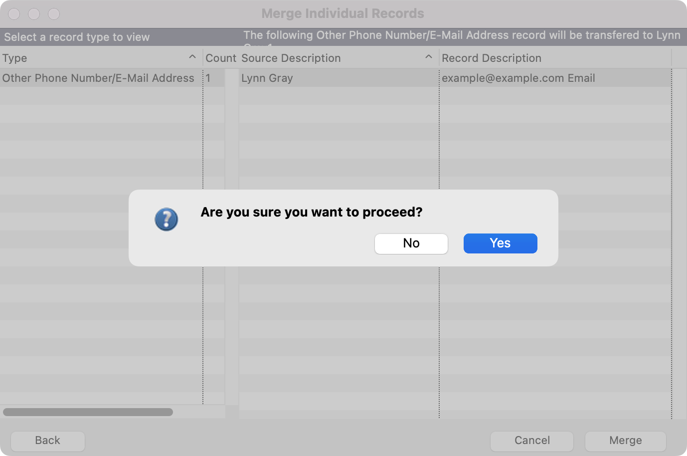 - In the next window, you will see all the associated data that will be merged under the final record. When ready, click on Merge to continue to merge the records together.