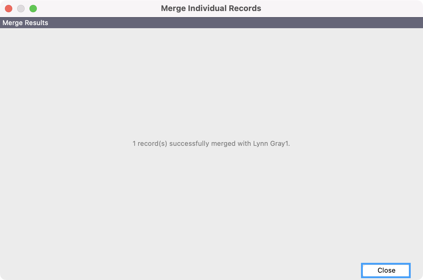 - You will then get a message that the records have successfully been merged. You can then click on Close.