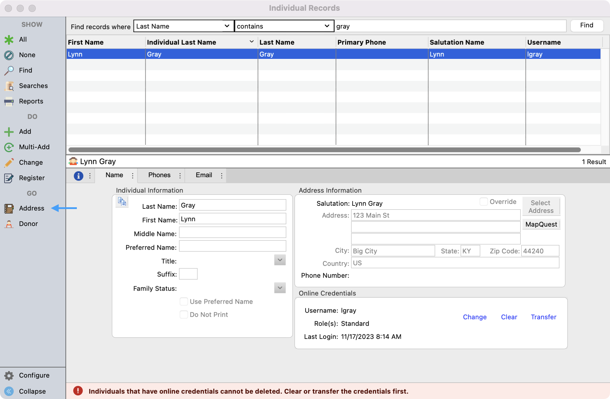 - From the Individual Record window, click on Address from the left-hand side menu.