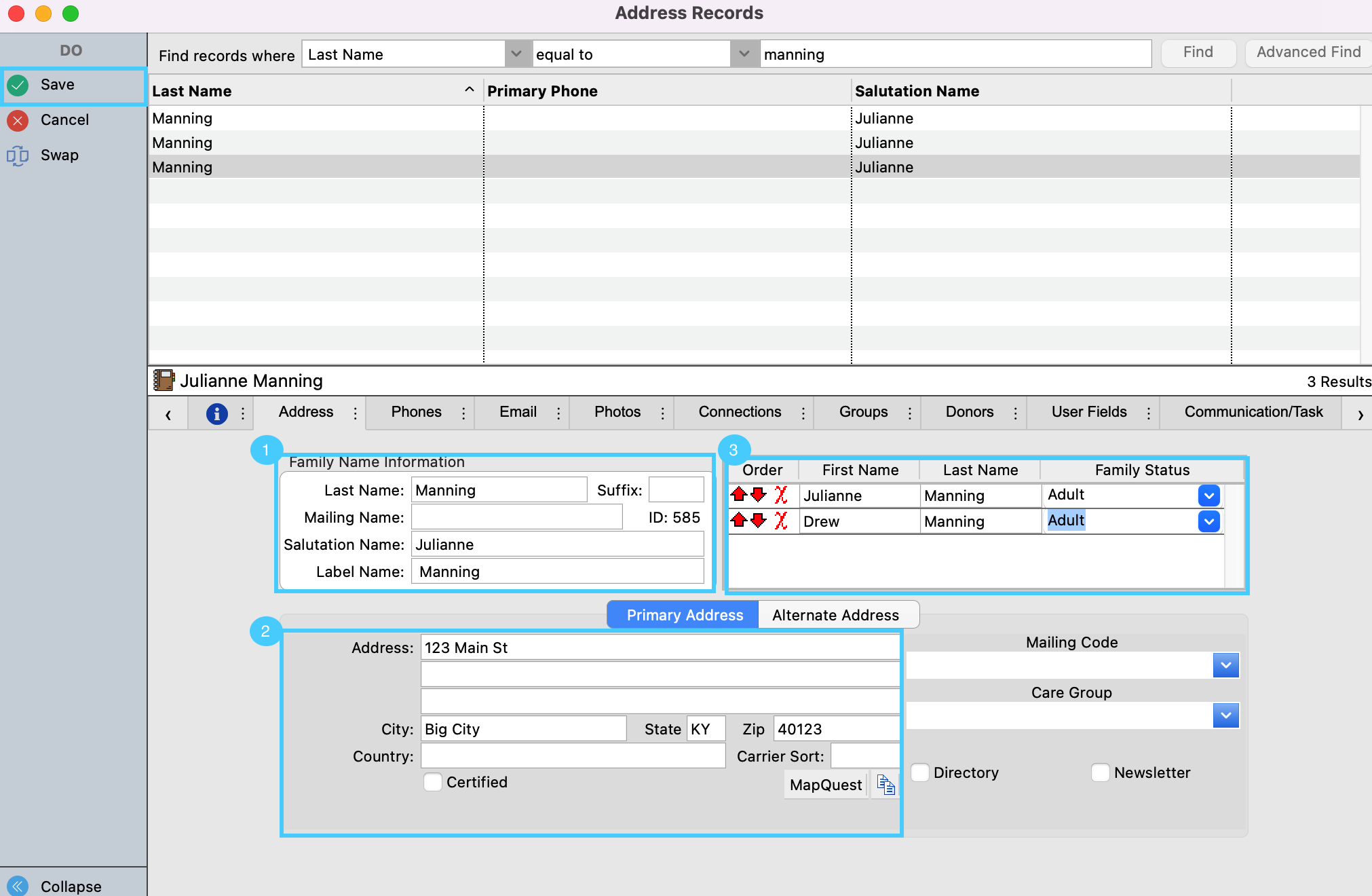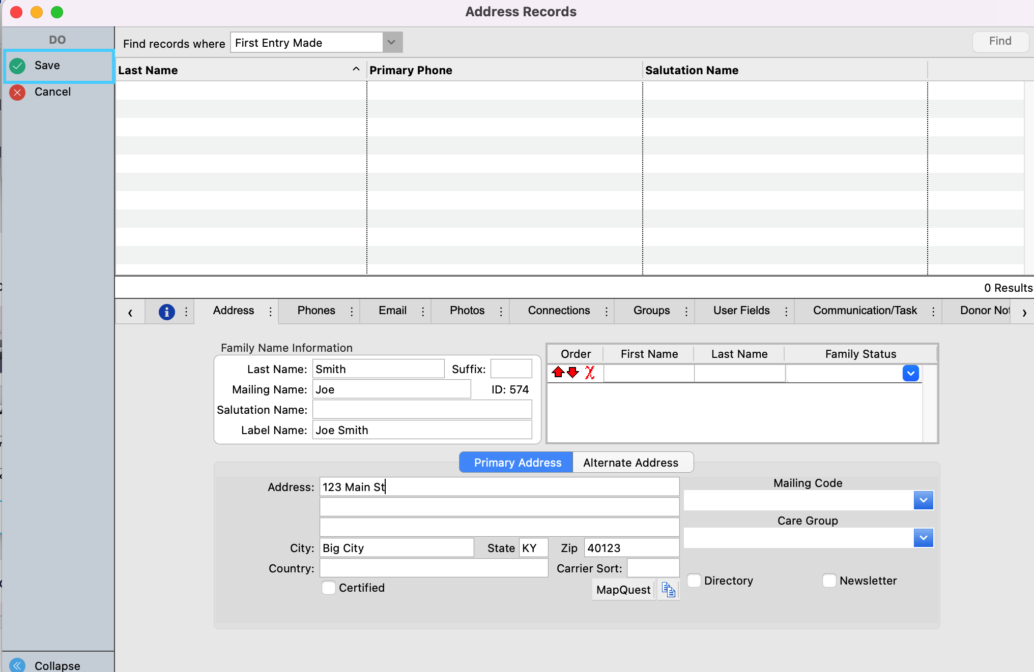 7. In the Address Record window, you will want to enter in the donor's Family Name Information. Second, you'll enter in their address information. Thirdly, you'll list the donor in the "Family Status" box. Please note this is a very important step as this is what will create their Individual Record. You can list other names at this same address in this section as well.