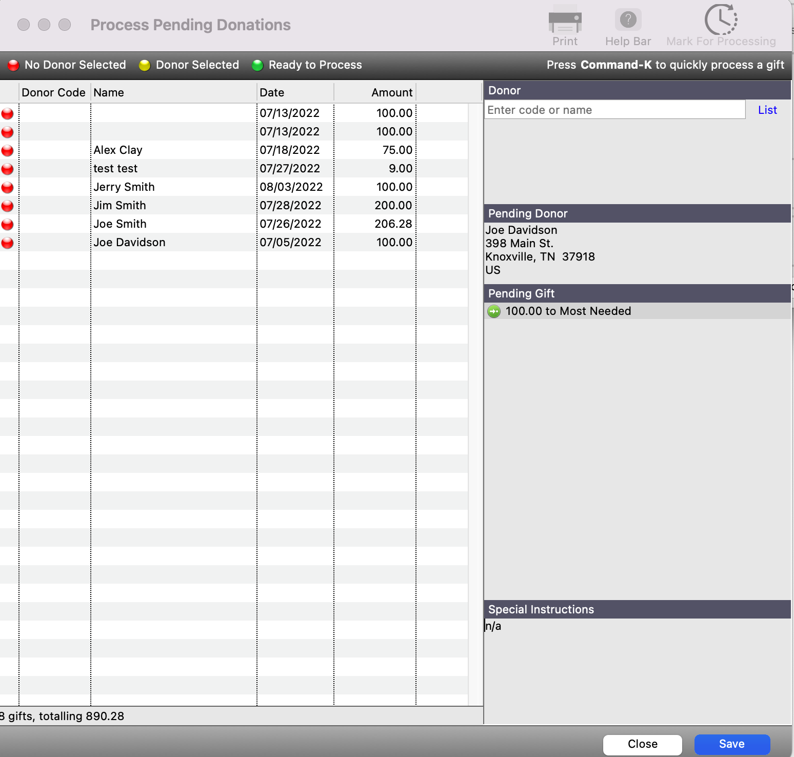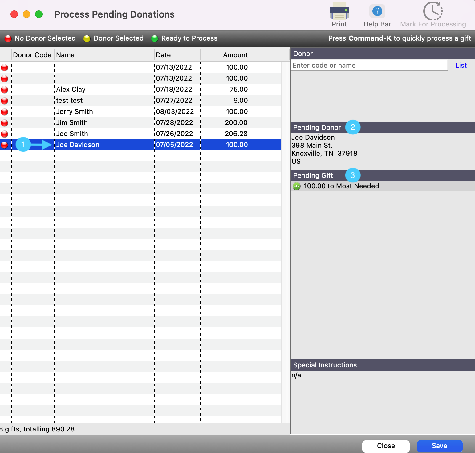 In the Process Pending Donation window, you will then see a window that will list all of your recent donations where someone has given as a guest. You will see a dot next to each donation record that represents a different status.