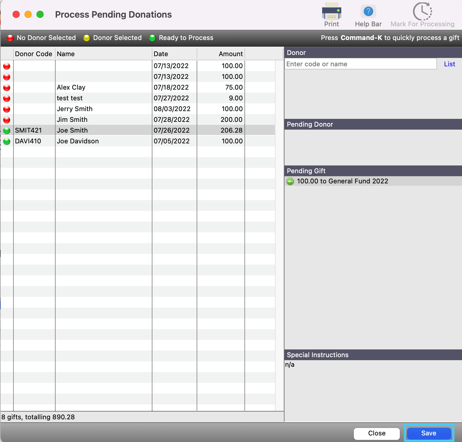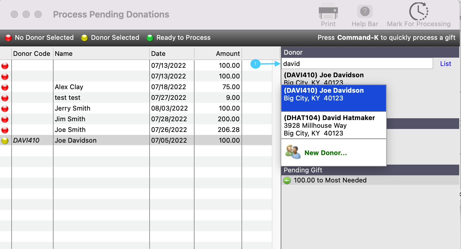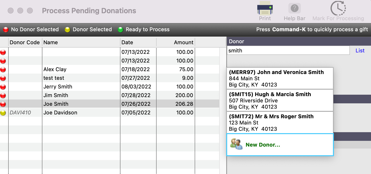 Back on the Process Pending Donations window, under the Donor search field, type the donor’s last name, but leave off the last letter. Then, hit tab on your keyboard. If they are the only donor with that last name, the system will automatically populate that Donor. If multiple donors have that last name, (like Smith,) a list of potential donors will appear. Double click on the correct record. The red dot will then turn to yellow.
