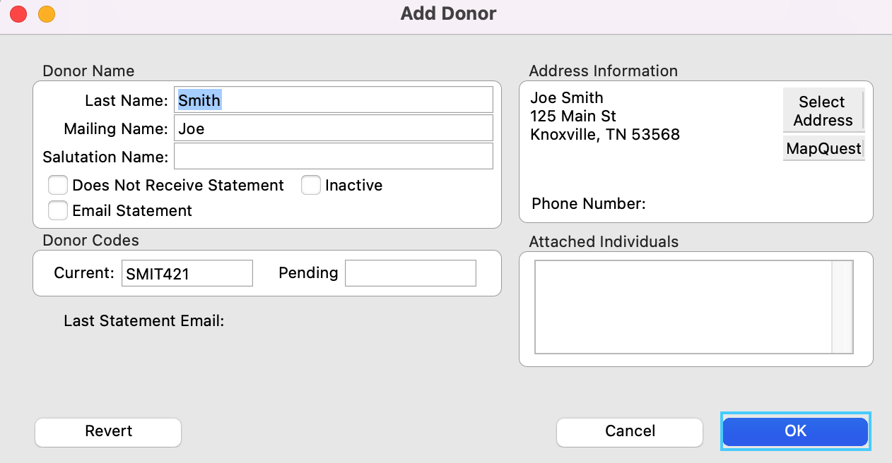 9.. After saving the address you will see another window that will allow you to save the Donor Record. Simply click on OK.