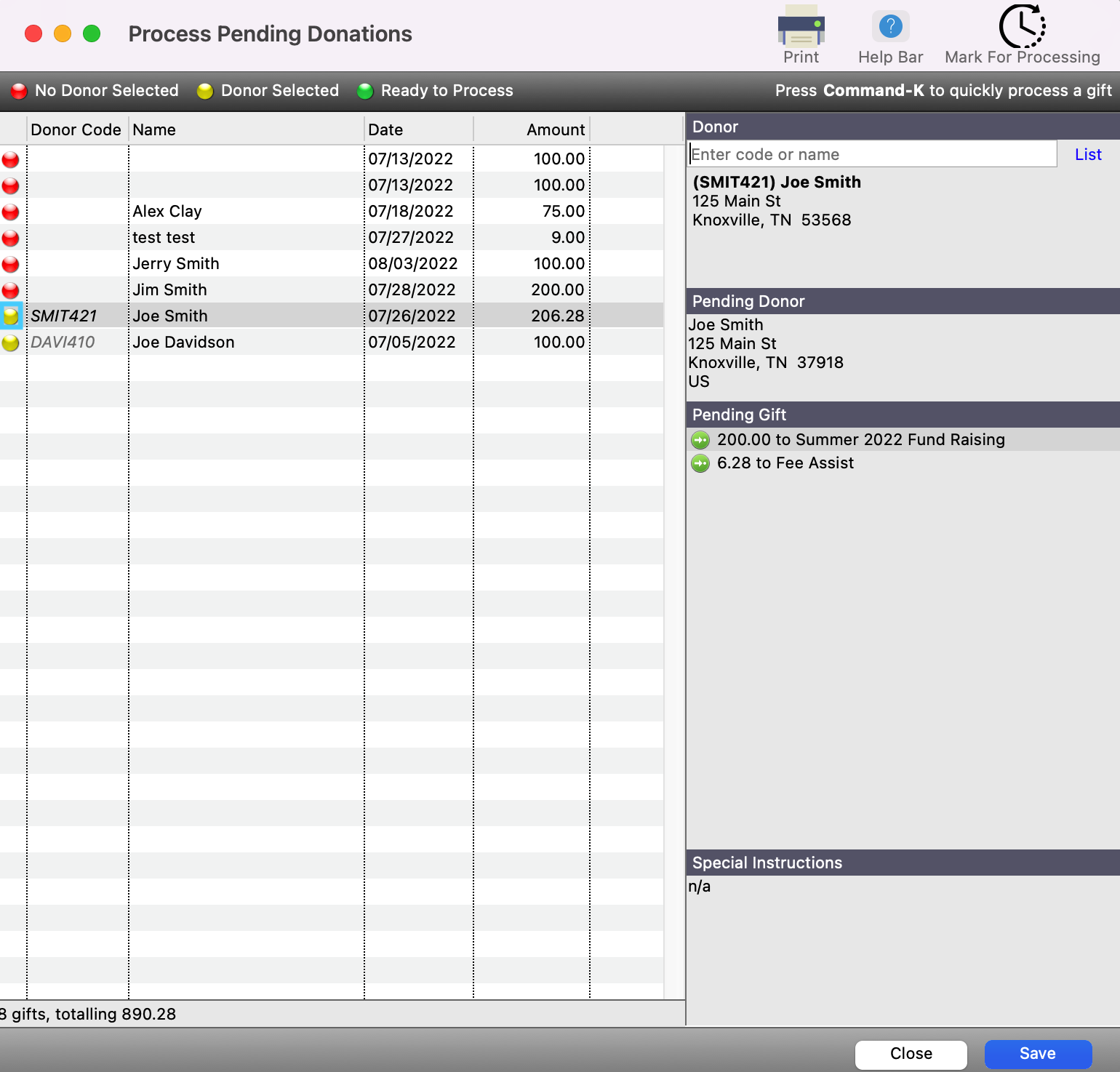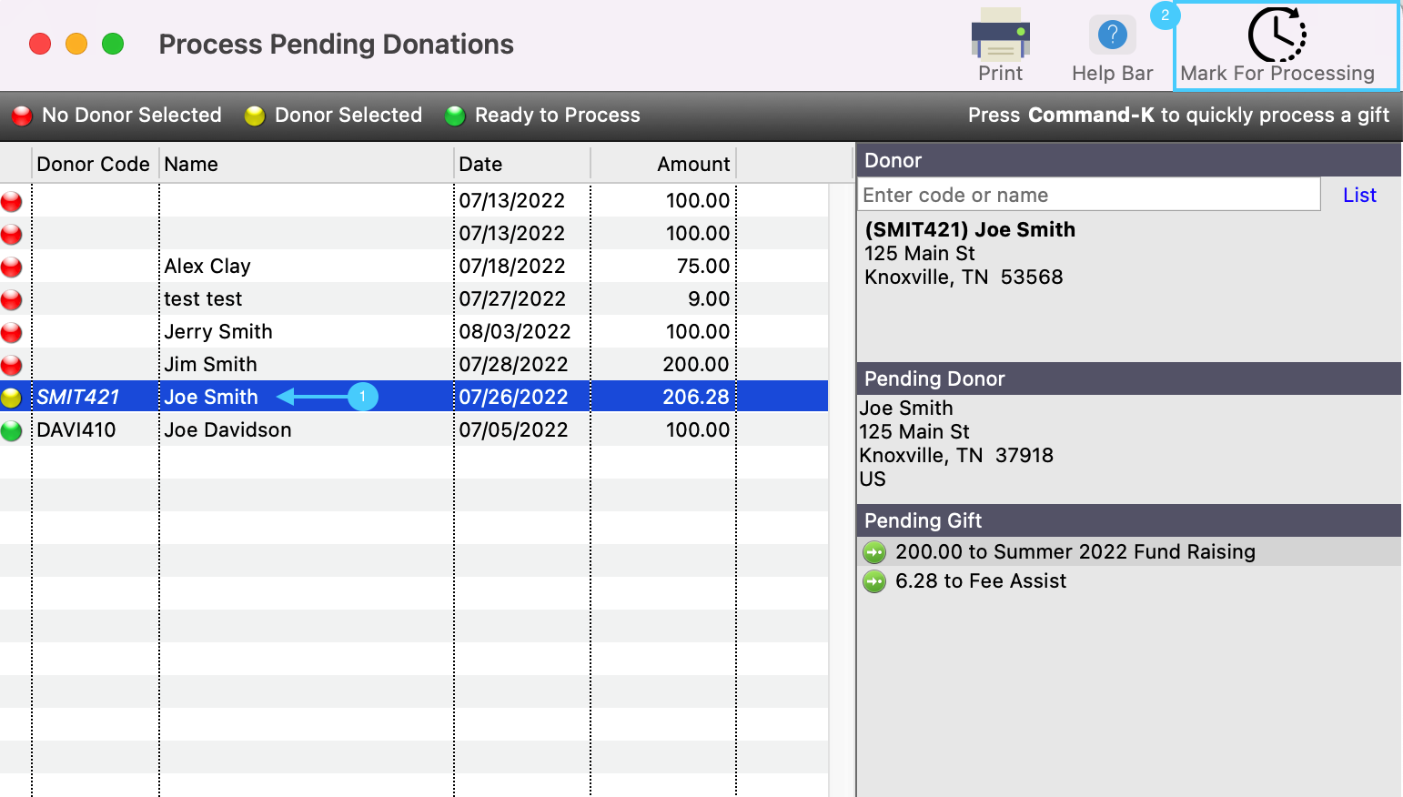 11. After you have reviewed all your donations and have associated them with an existing Donor record or have created a new one, you can now mark these records for processing. Simply click on the record with the yellow dot and then click on Mark for Processing. Then you will see the dot next to the donation turn to green.