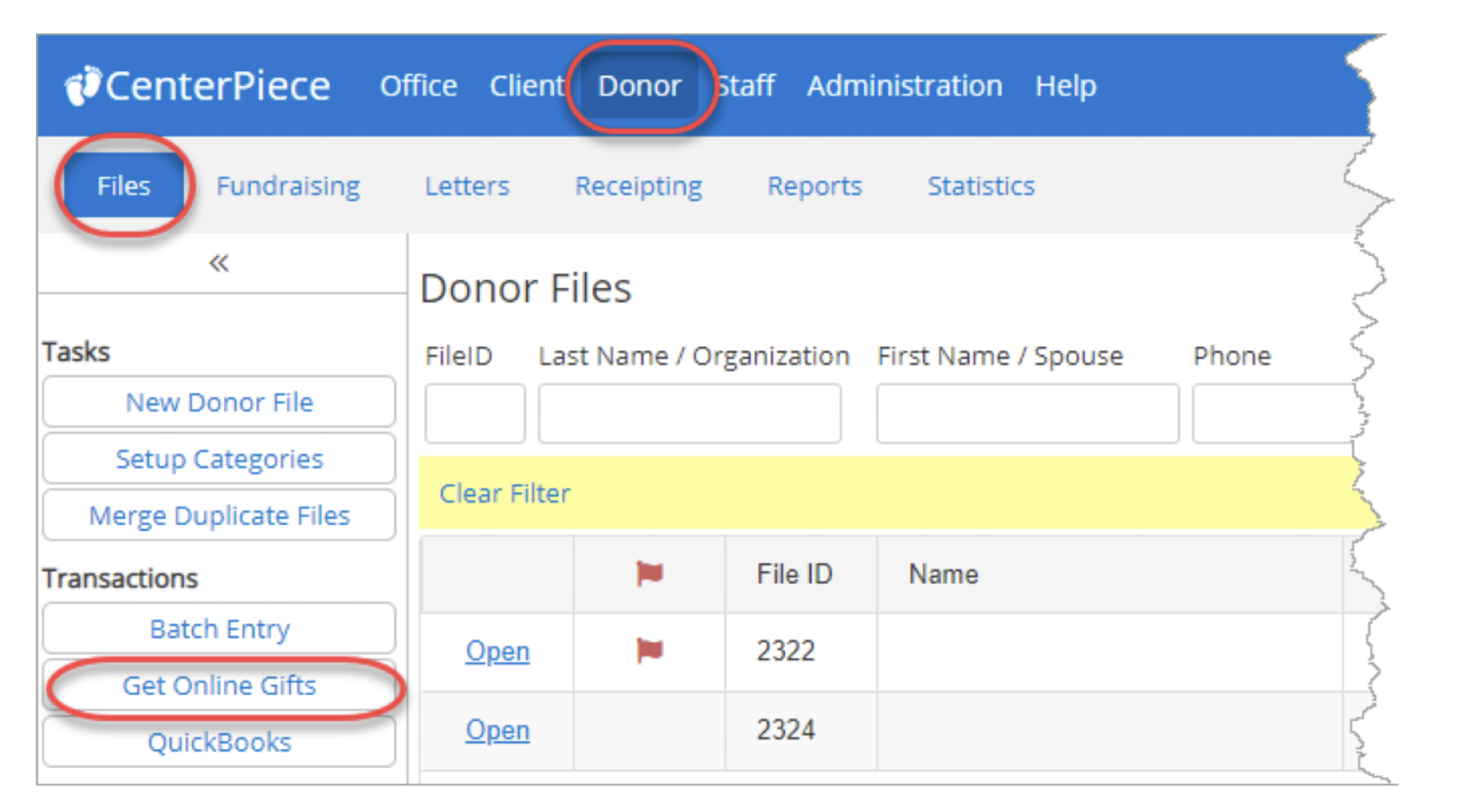 In eKyros under Donors, click on Get Online Gifts.