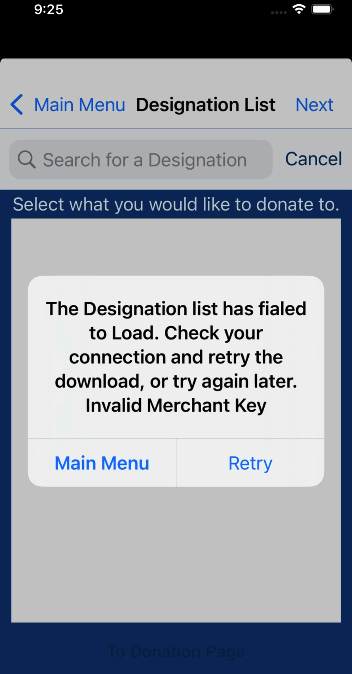 If a donor tries to use the eGiving app after their account has been migrated, they will likely see a message that says or is similar to "The Designation list has failed to Load. Check your connection and retry the download or try again later. Invalid Merchant Key." This is a signal that their account has been migrated and will no longer be able to use the eGiving app.