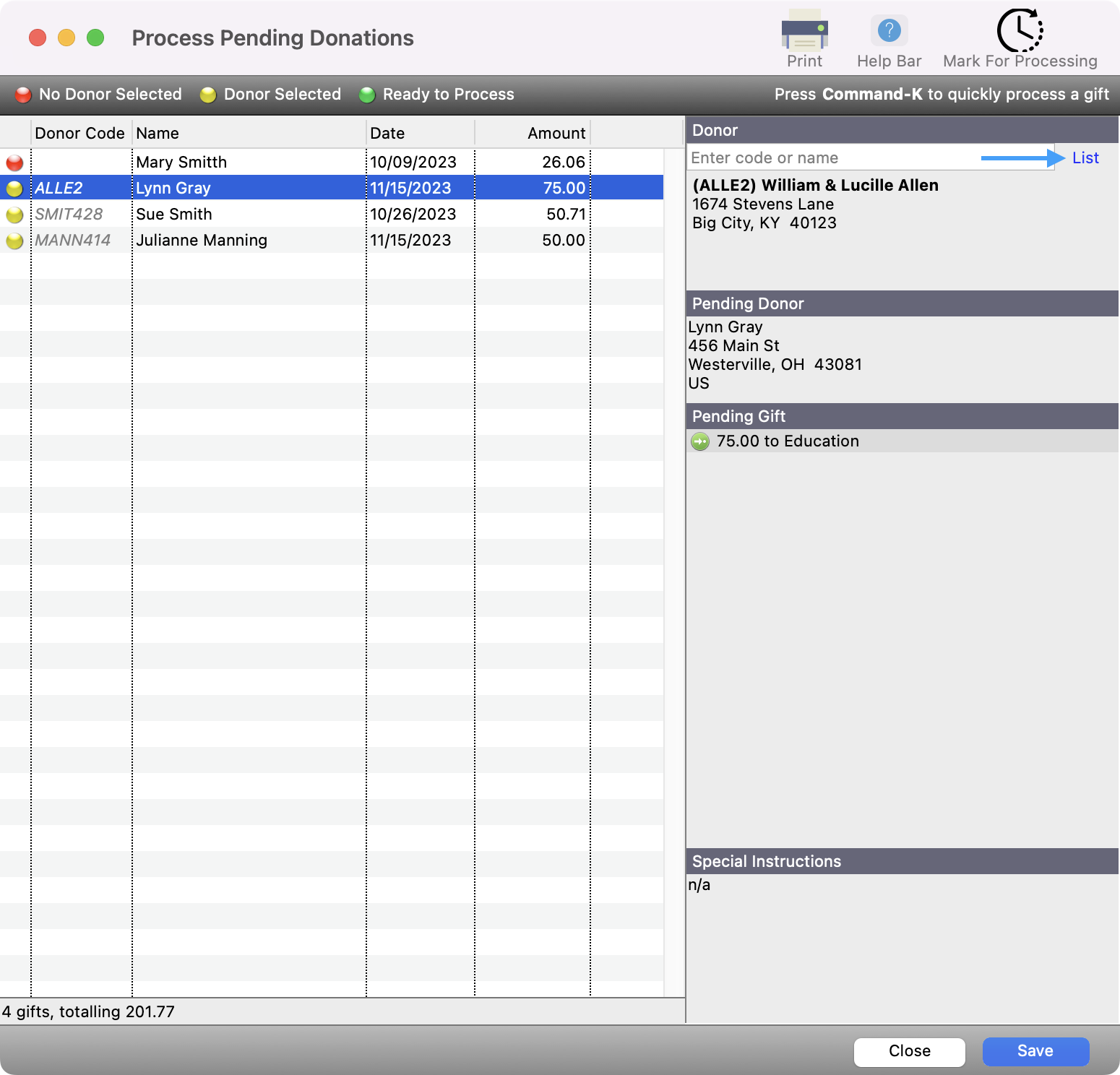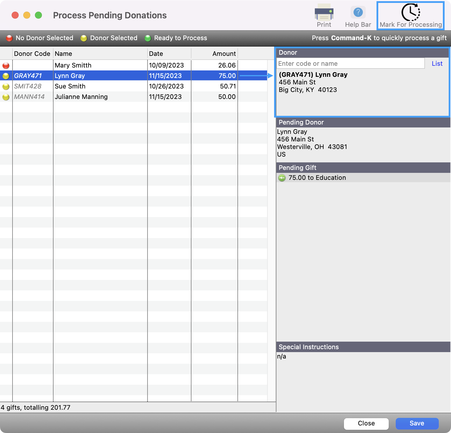 - You will then see that their donation is now tied to that Donor record and you can proceed to Mark For Processing and finish processing this donation.