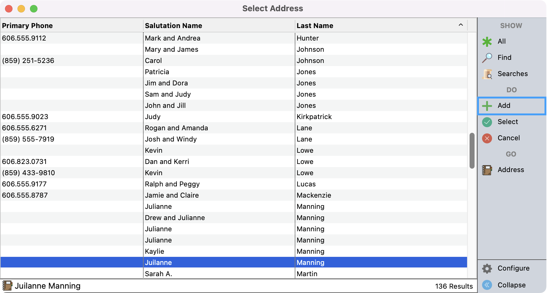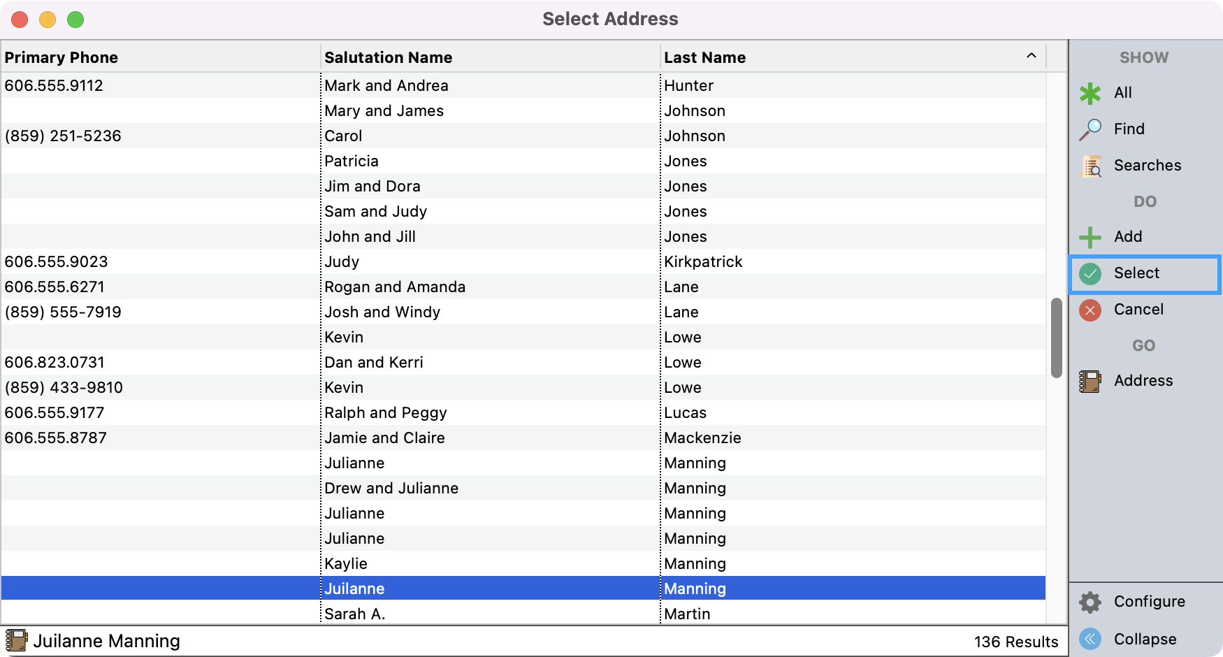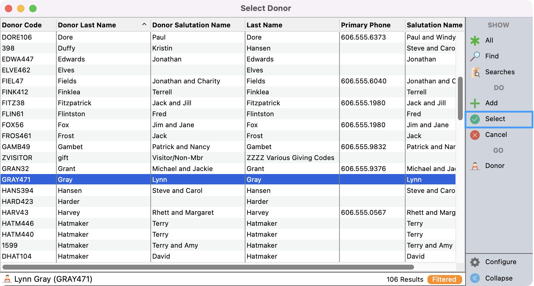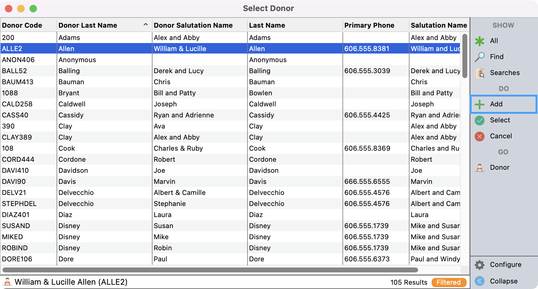 This will bring up a list of your donors. If this donor already has a Donor record, you can find this record, click to highlight it, and then click on Select on the right-hand side menu.