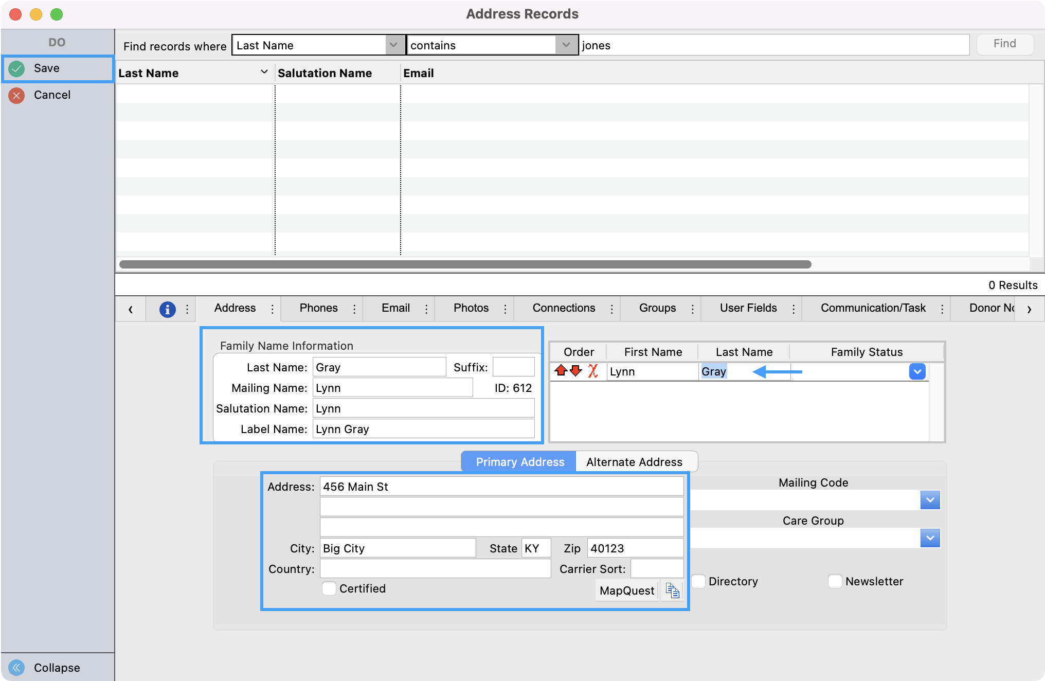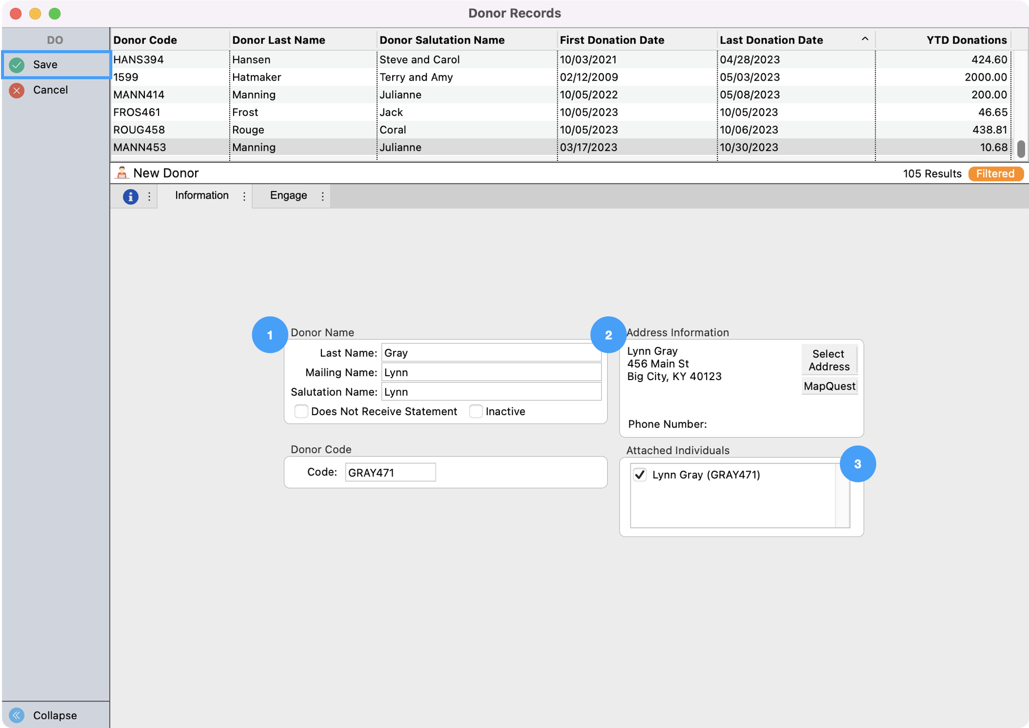 - You then will see the Donor Record window. Double check that the donor's Name, Address Information, and Attached Individuals are all correct and then click on Save in the upper left-hand corner.