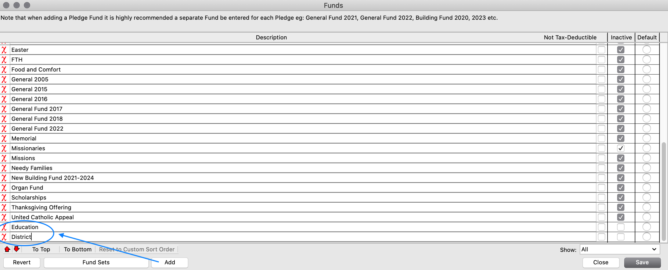 Click Add on the bottom of the Funds window, and add two funds labeled Education and District, then click Save.