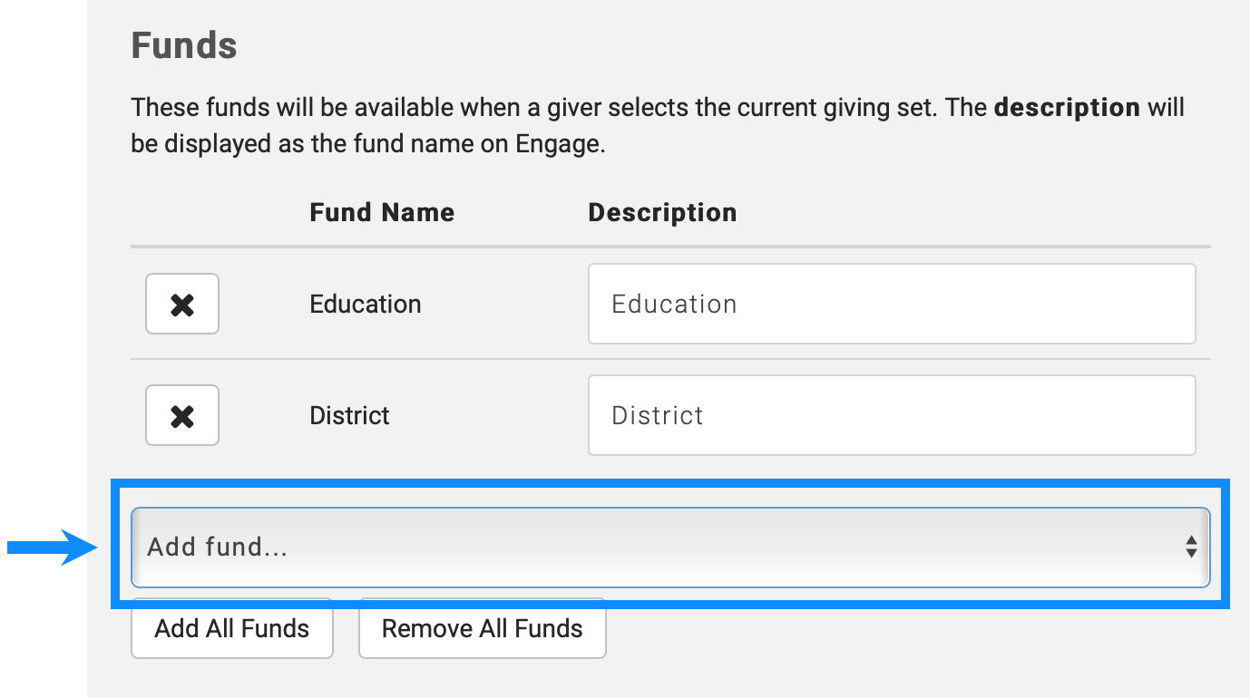 Scroll down to Funds, click the Add fund... dropdown menu, and select Education and District. These are the two new funds you just created.